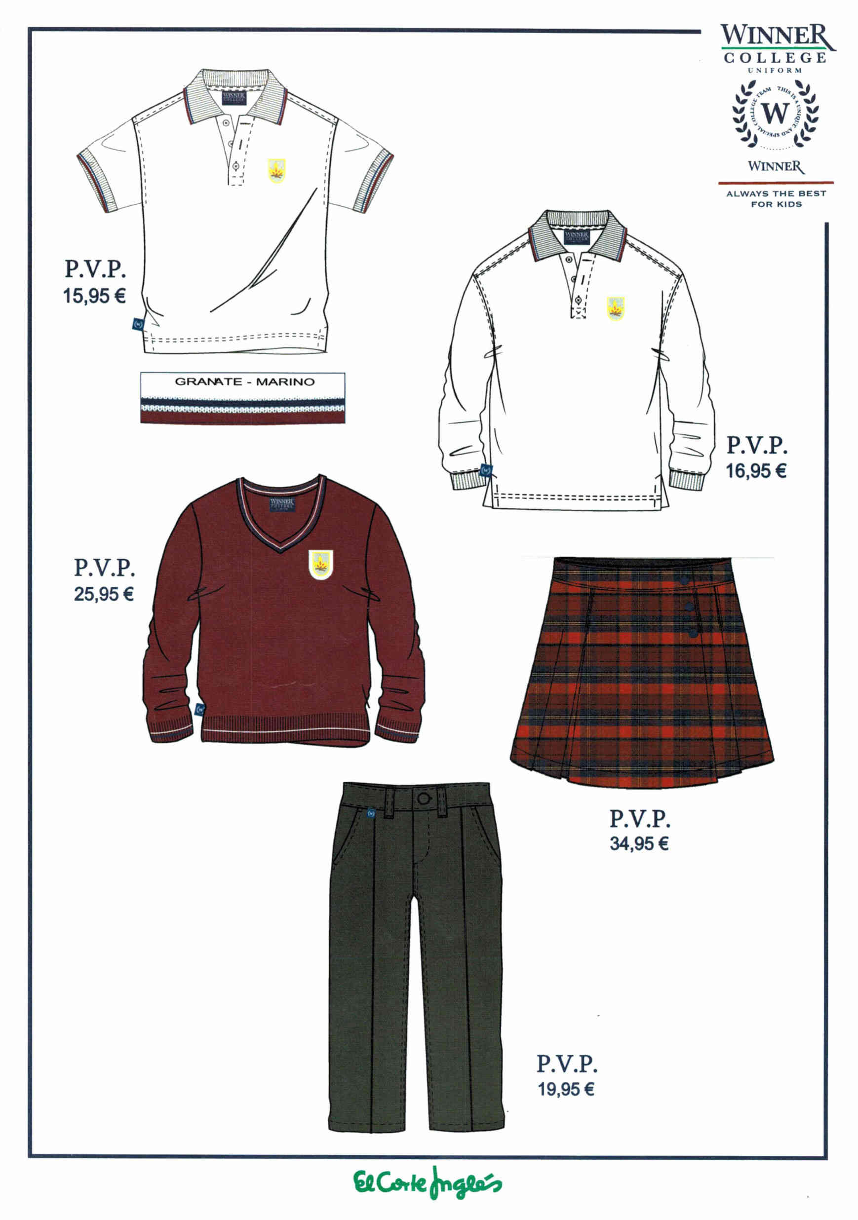 En las etapas de Infantil, Primaria y ESO el uniforme completo y limpio, que se adquiere en El Corte Inglés y se compone de: